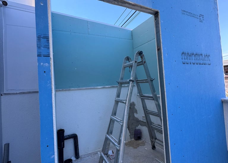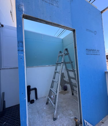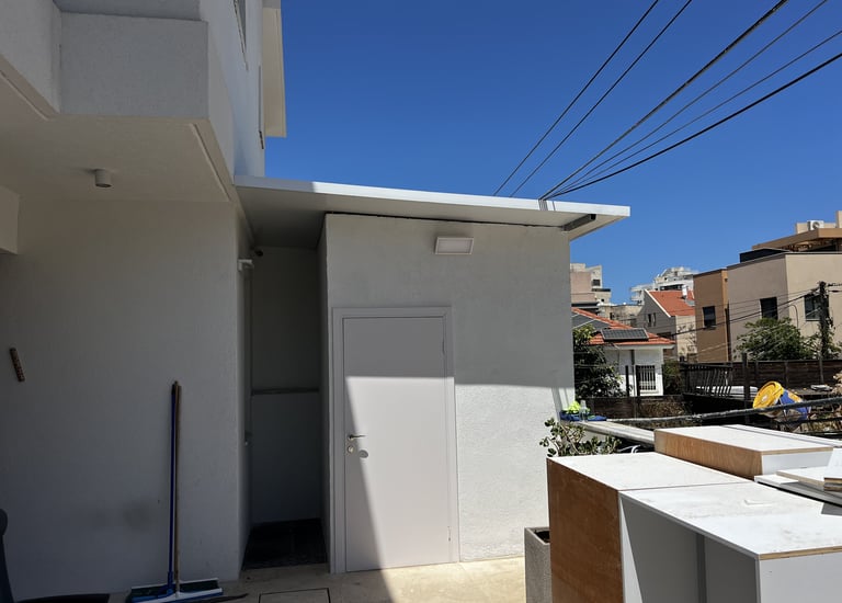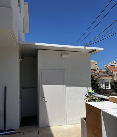 תוספת חדר כביסה חיצוני מגבס כחול ופנל אלומיניום